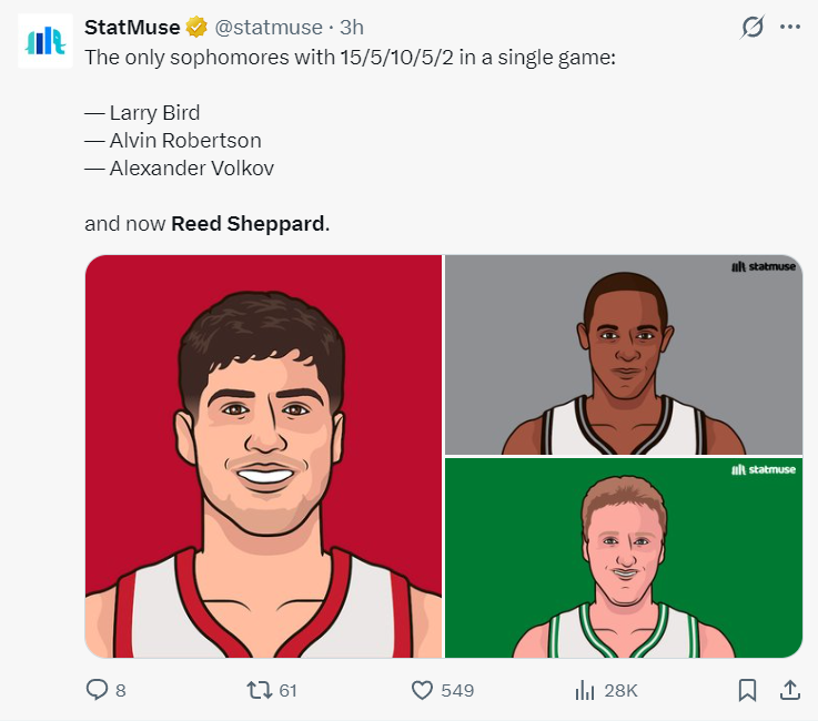 6.谢泼德是火箭队史最年轻的10+10+5抢断的球员。